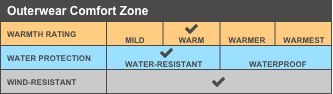- 94/6 poly/spandex woven mini ripstop with a DWR finish bonded to a water-resistant film insert and a 100% polyester brushed tricot interior
